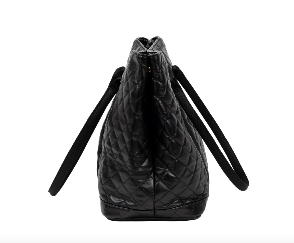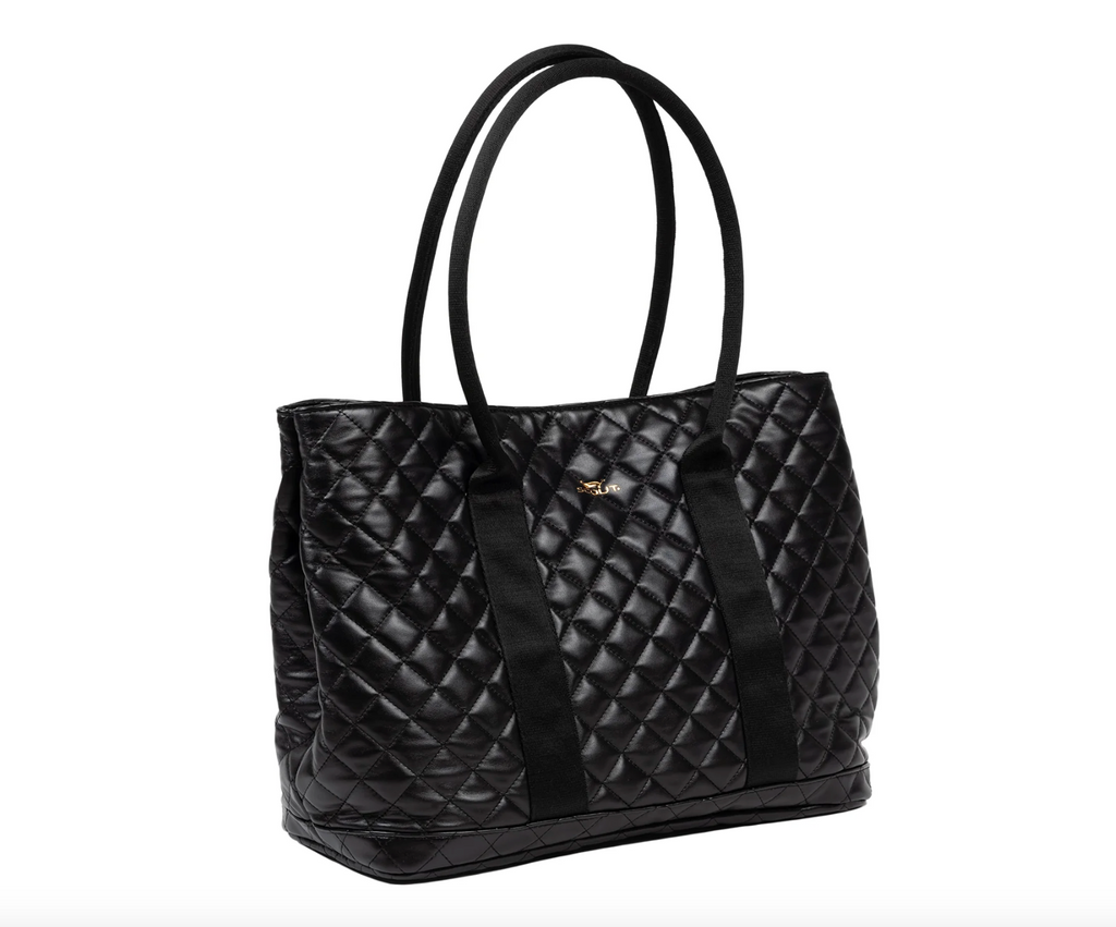A STATELY RESIDENCE FOR ALL YOUR STUFF. Destined to become your new favorite bag, this chic, quilted carryall is super roomy with a large, flat bottom and "pleated" sides you can unsnap for extra expansion. The interior zip pocket is great for keys, phone, and other essentials. Snaps shut at top.