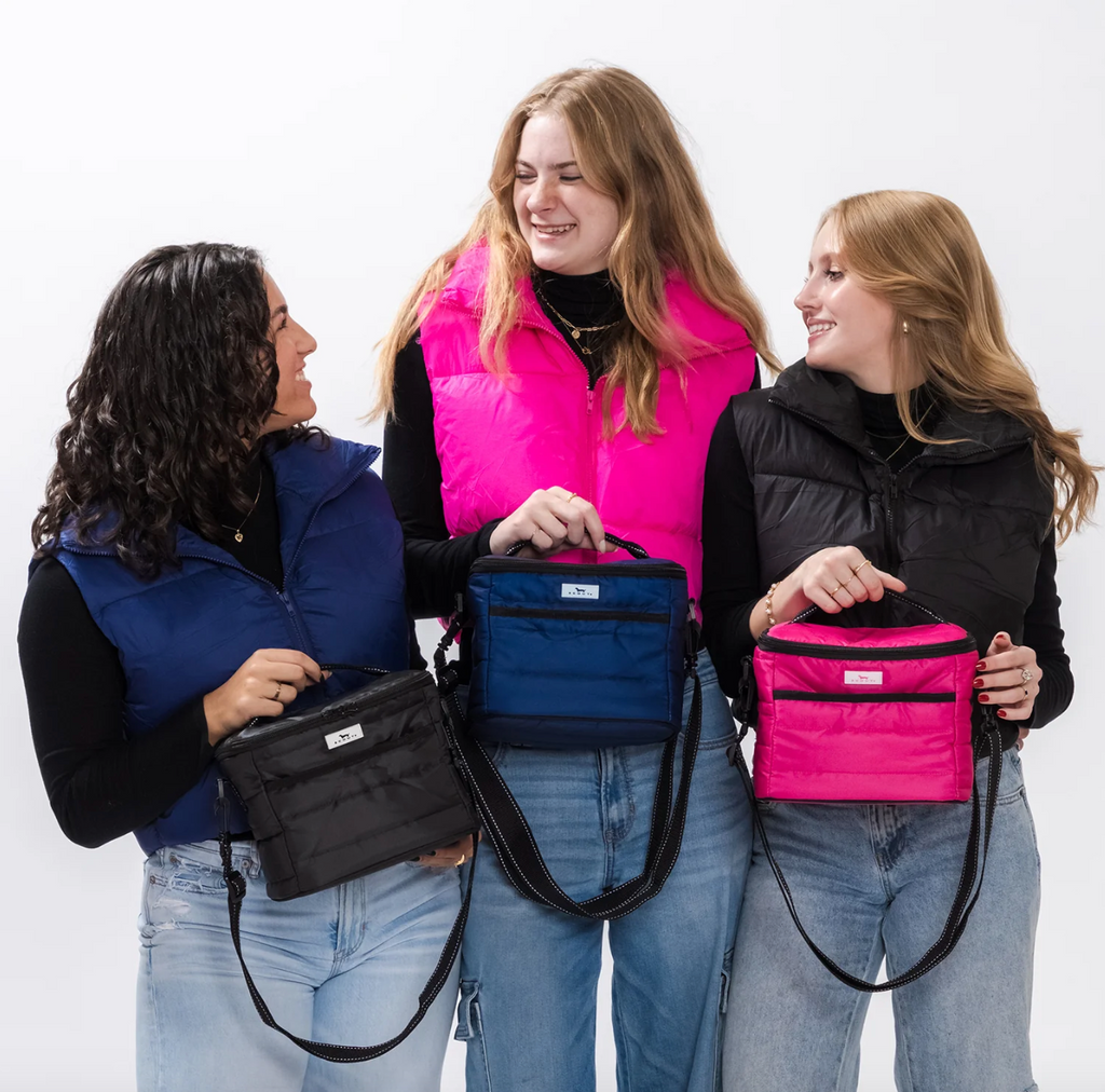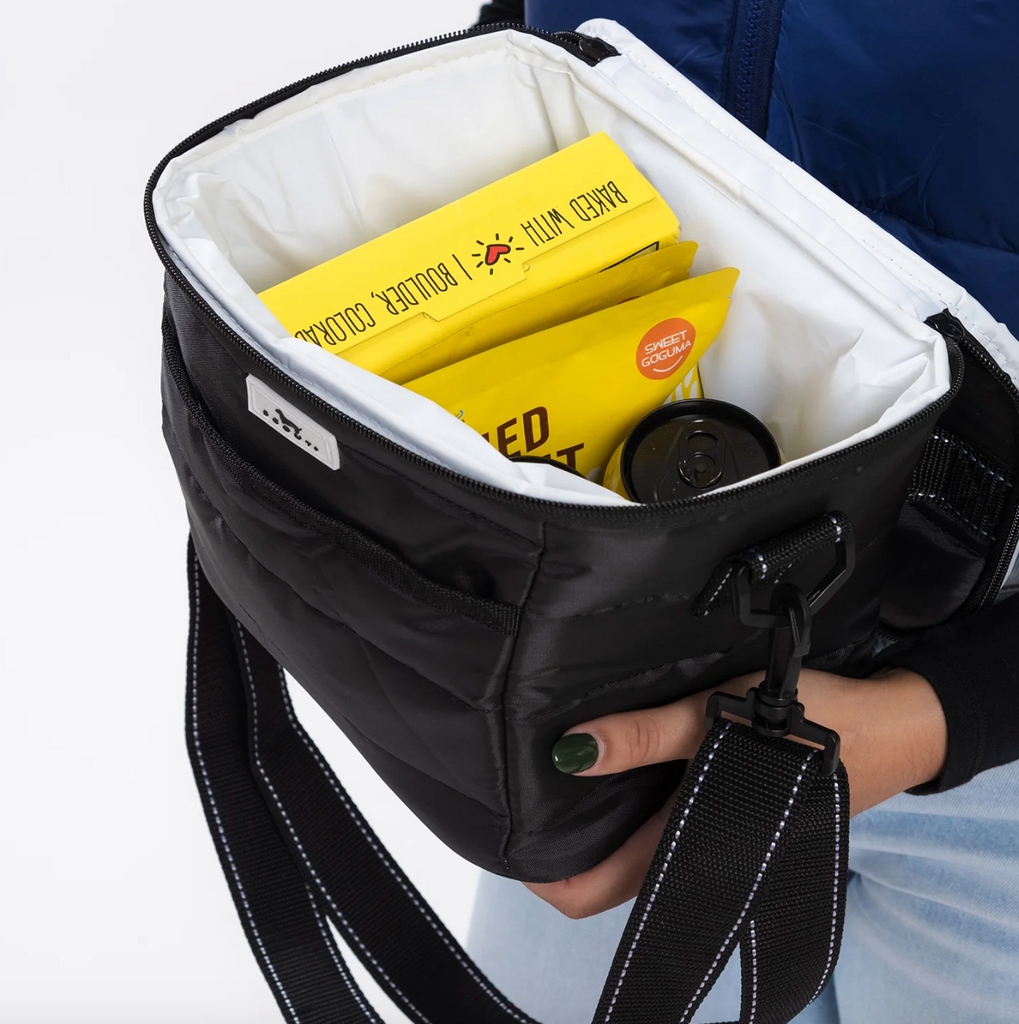 PUFFED UP FOR LUNCH. Designed with solid colors and soft, puffer fabric, this insulated cooler is more than just a lunch box – it's your trusty sidekick. Whether you're headed to a picnic, brewery tour, or BBQ, it keeps your drinks and snacks cool in a fun and fresh way. The soft sides give it a cushiony feel, while the crossbody strap ensures you can take it anywhere hands-free and worry-free. Lightweight, portable, and oh-so-stylish for dining al fresco.