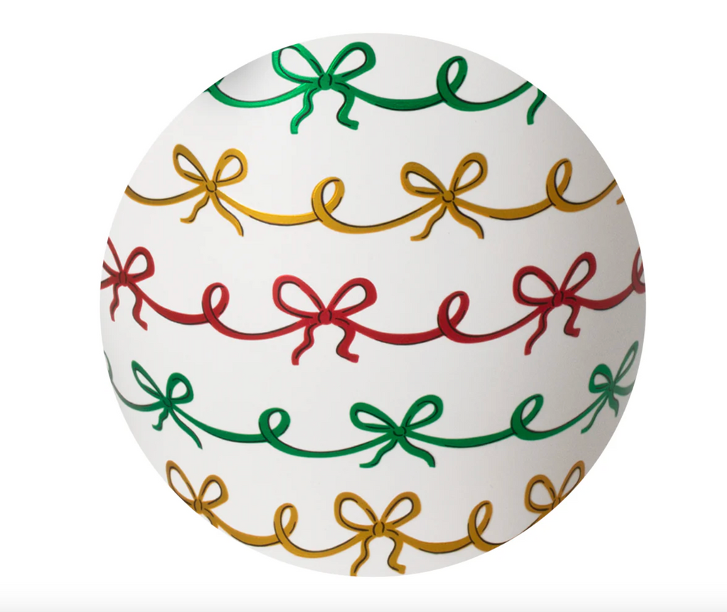 Mega sips, mega chill! 🧊 Get wrapped up in traditional holiday charm with red, green, and gold metallic bows on a glitter ivory background. A removable charming bow adorns each item like a gift. 🎀