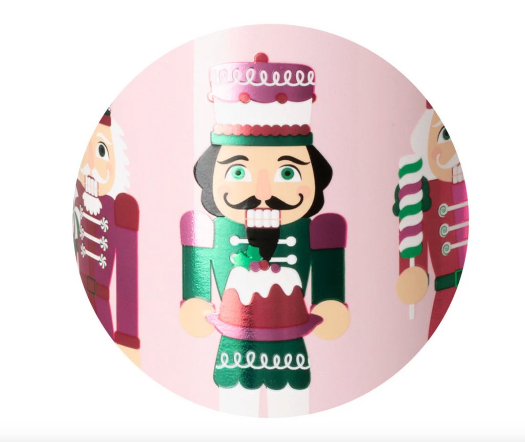 We've got it handled! ☕ Metallic toy soldiers dressed with peppermints and holiday candy march around a pale pink glitter background.